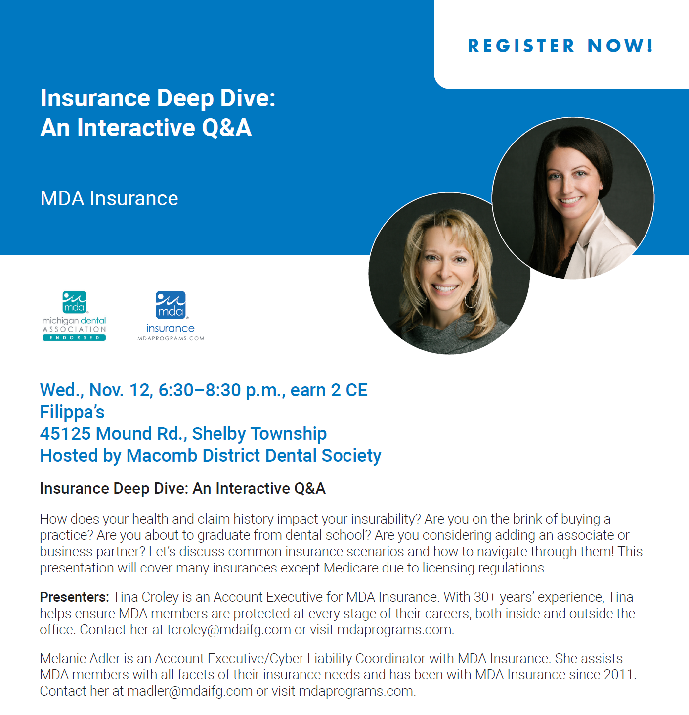 The Macomb Dental Society is currently registering for: Young Dentist Meeting Wednesday 11/12/2025 General Meeting 12/3/2025