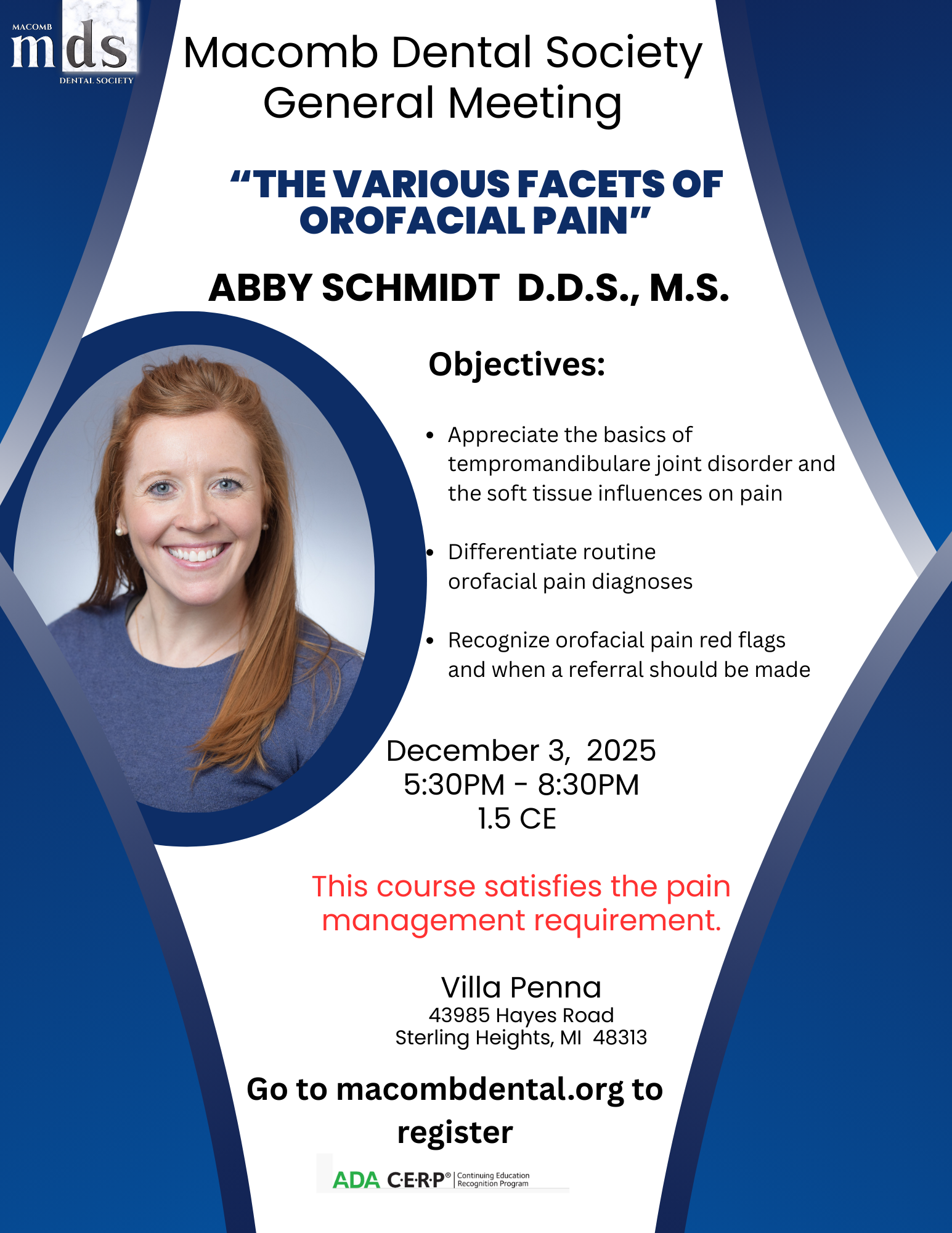 The Macomb Dental Society is currently registering for: Young Dentist Meeting Wednesday 11/12/2025 General Meeting 12/3/2025